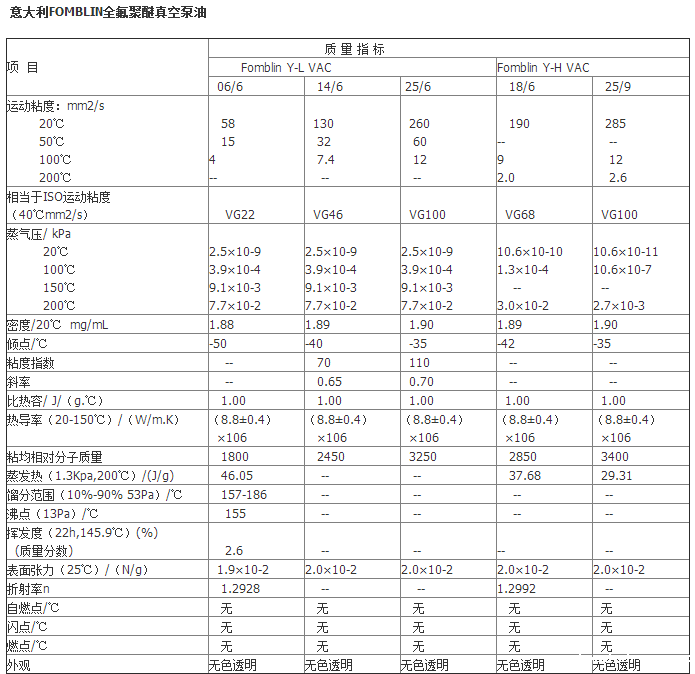 Fomblin Y 等级的全氟聚醚液主要是用作真空泵的润滑剂。全氟聚醚液是氟*********的混合体。氟*********是在***************下提取的,最早的状态是************。因为Fomblin的************元素只包括碳、氟、和氧原子,所以这些全氟聚醚液产品具有一些额外的特性: